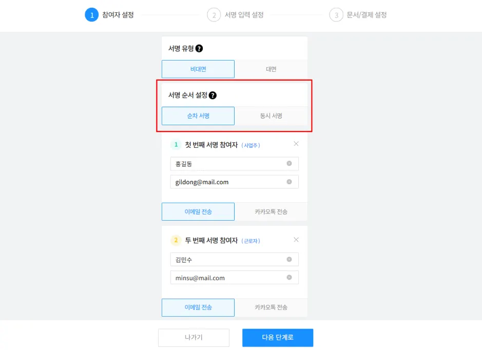서명 요청하기 첫 단계인 참여자 설정 화면에서 서명 순서 설정 옵션을 설정할 수 있습니다.