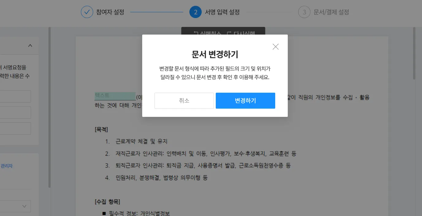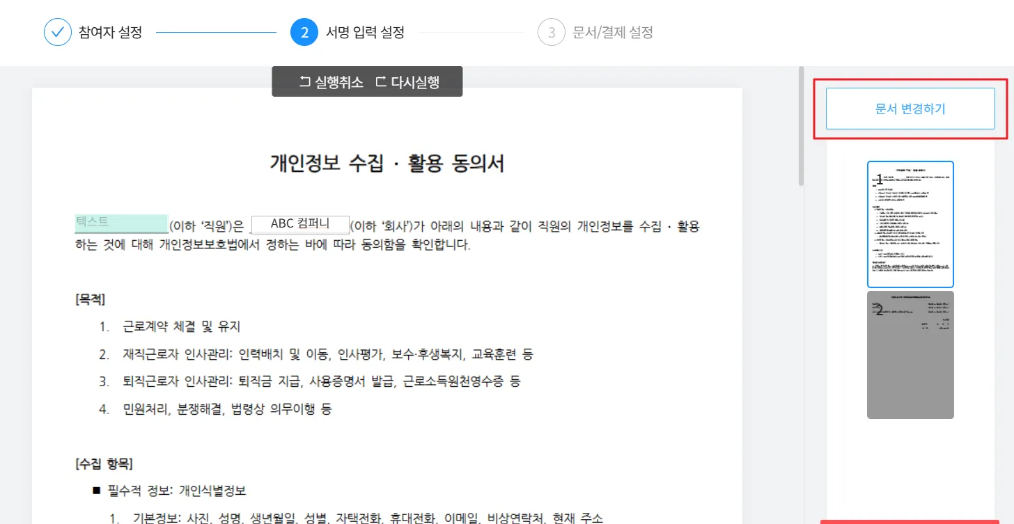 업로드한 문서에 참여자 입력란 추가/설정을 모두 마친 상태에서
