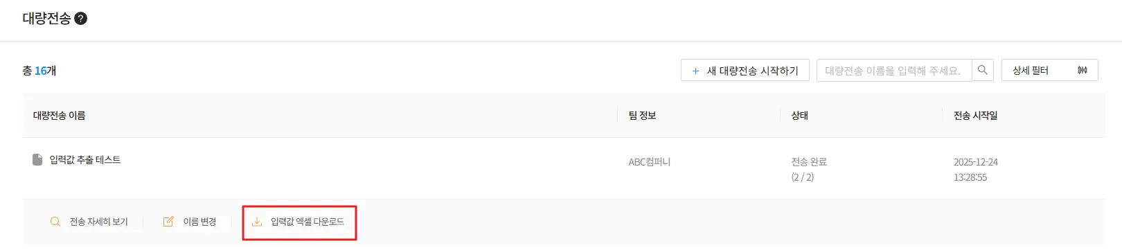 대량전송 화면에서 입력값 엑셀 다운로드를 원하는 대량전송건을 클릭 후,