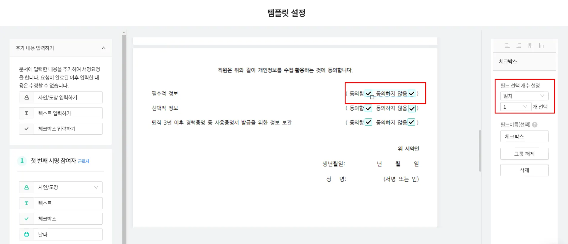 1) 사인/도장: 참여자가 직접 사인 또는 도장을 입력할 수 있는 필드로 하나 이상의 필수 조건의 서명이 추가되어 있어야 합니다.