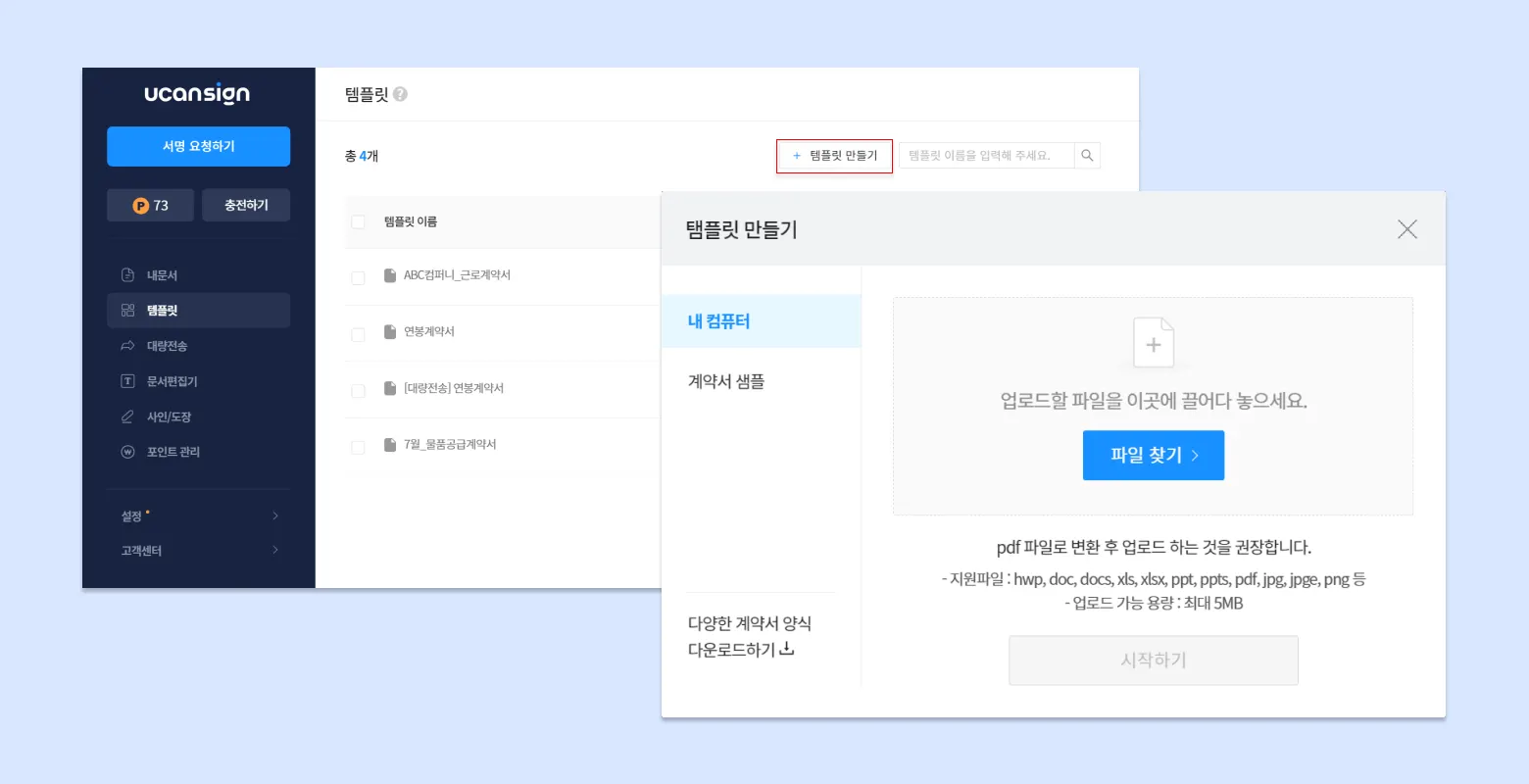 템플릿 페이지 > [템플릿 만들기] 버튼을 클릭 후, 평소 사용하던 양식은 내 컴퓨터 > [파일 찾기]에서 업로드 하고, 양식이 없는 경우, 샘플 계약서를 이용할 수 있어요.