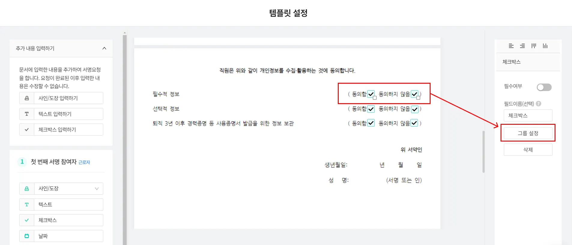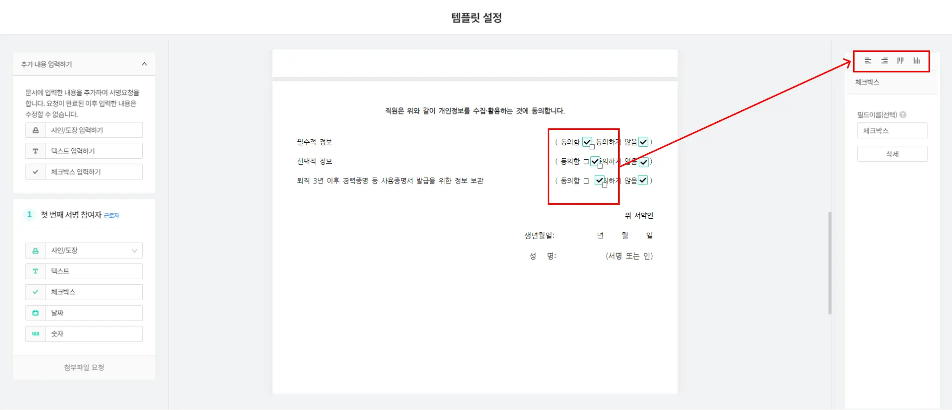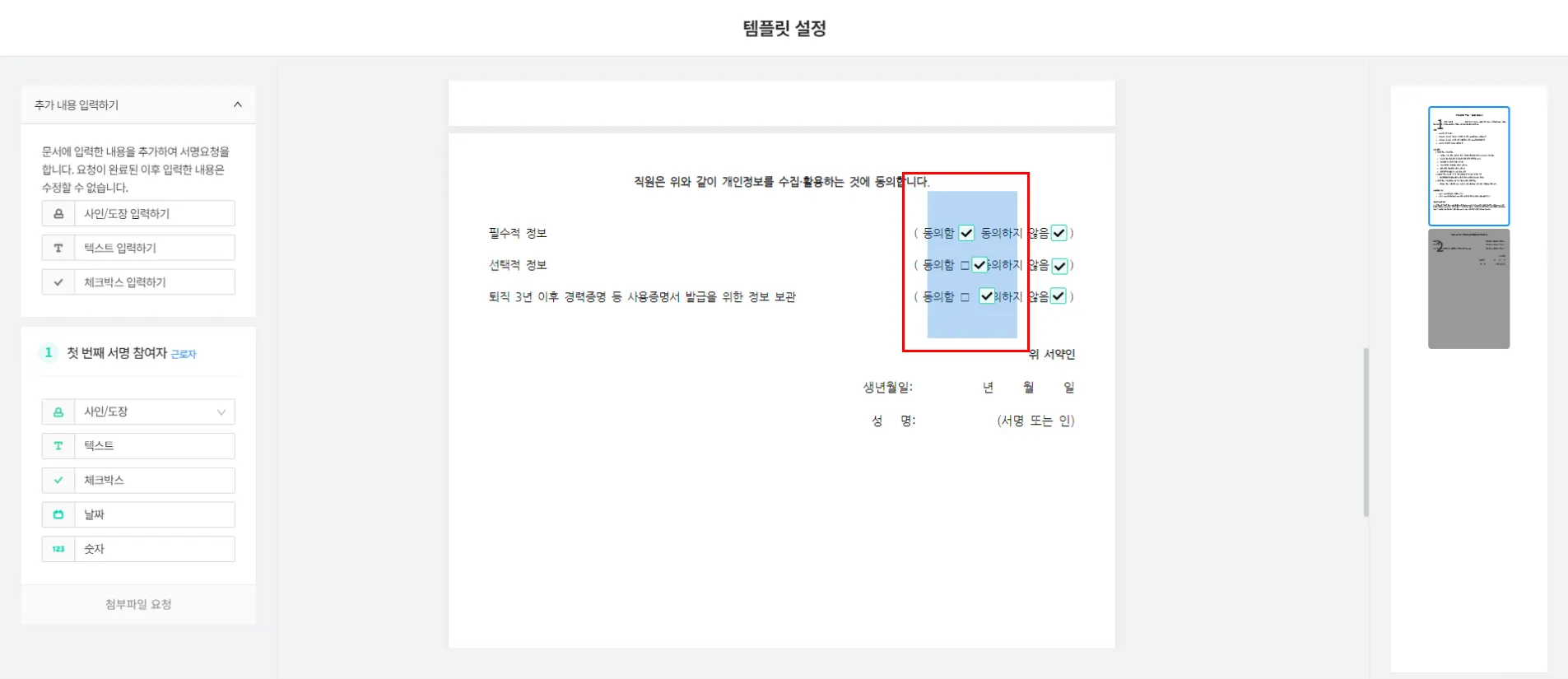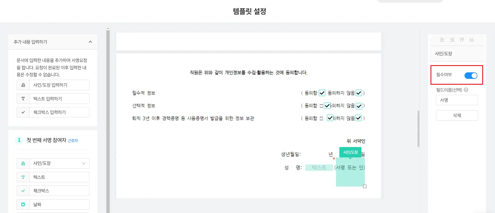 기존에 서명 필드는 무조건 필수 조건으로 설정되었는데, 선택 조건으로도 설정할 수 있게 바뀌었습니다.