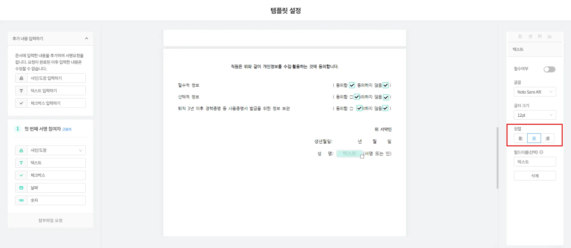 텍스트가 입력되는 필드의 경우, 텍스트 위치 정렬을 지정할 수 있습니다.